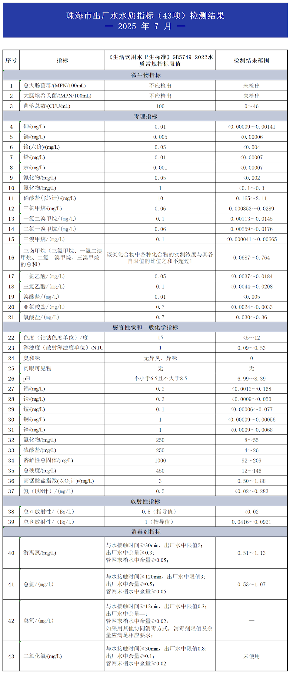 2025年7月珠海市出厂水水质指标(43项)检测结果