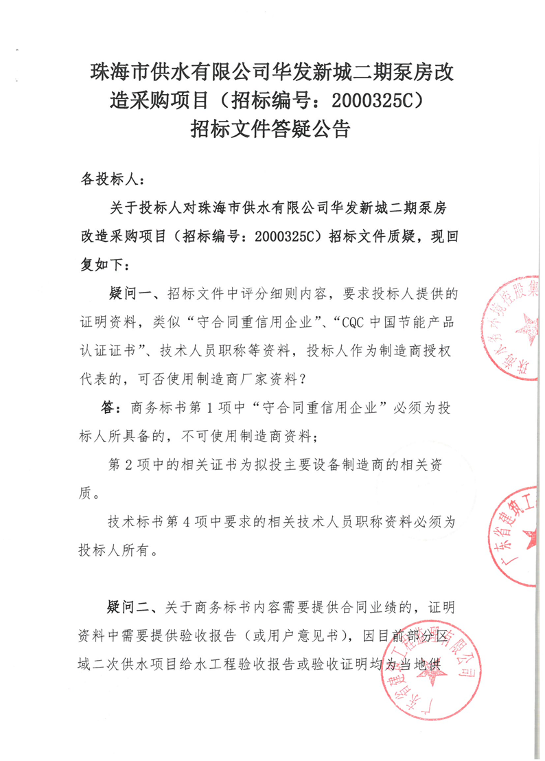 珠海市供水有限公司华发新城二期泵房改造采购项目答疑公告