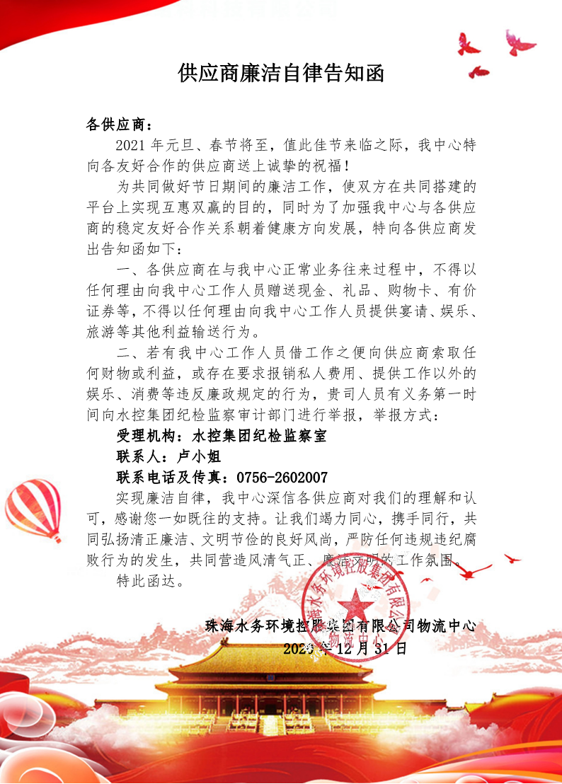 供应商廉洁自律告知函