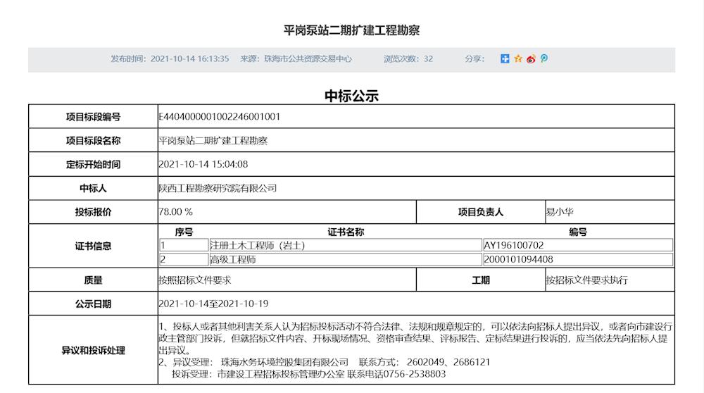 平岗泵站二期扩建工程勘察项目中标公示