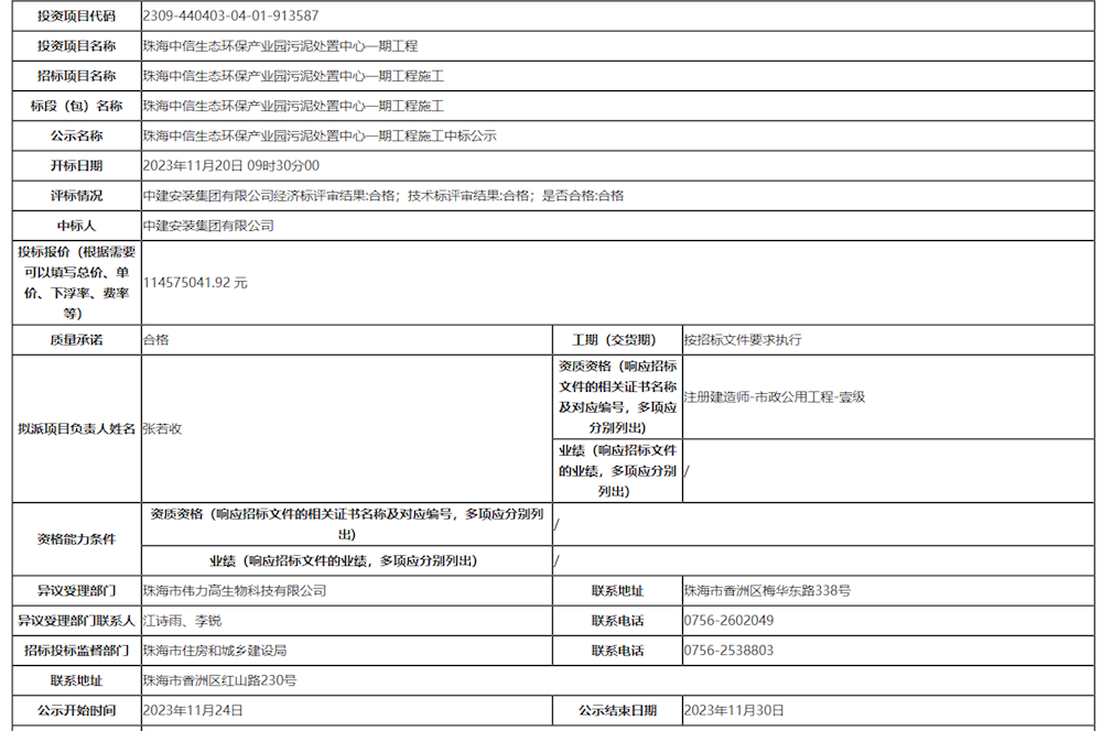 珠海中信生态环保产业园污泥处置中心一期工程施工中标公示
