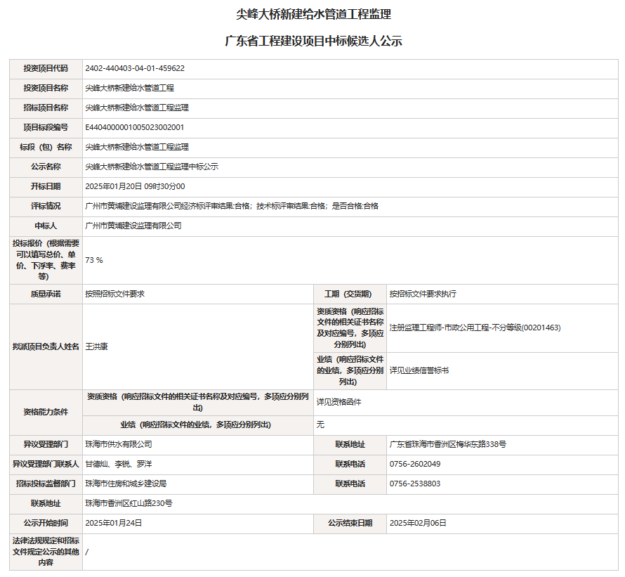 尖峰大桥新建给水管道工程监理中标候选人公示